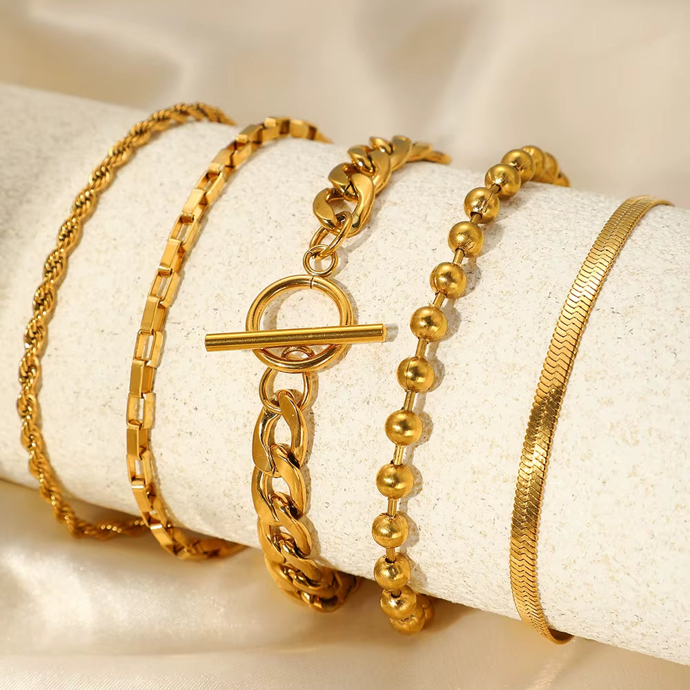 Style: This 5-piece bracelet stack features a curated mix of luxe chain styles—from bold links to delicate details—designed to layer perfectly or stand alone. A versatile set that adds instant polish to any look. Material: Crafted from high-quality stainless steel for durability, shine, and tarnish resistance. Size: Use image as reference for sizing of the bracelets.