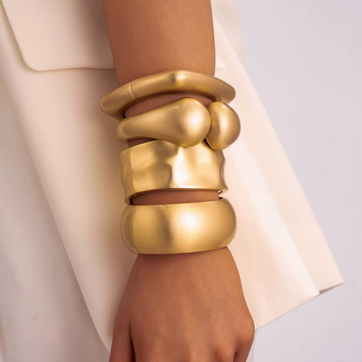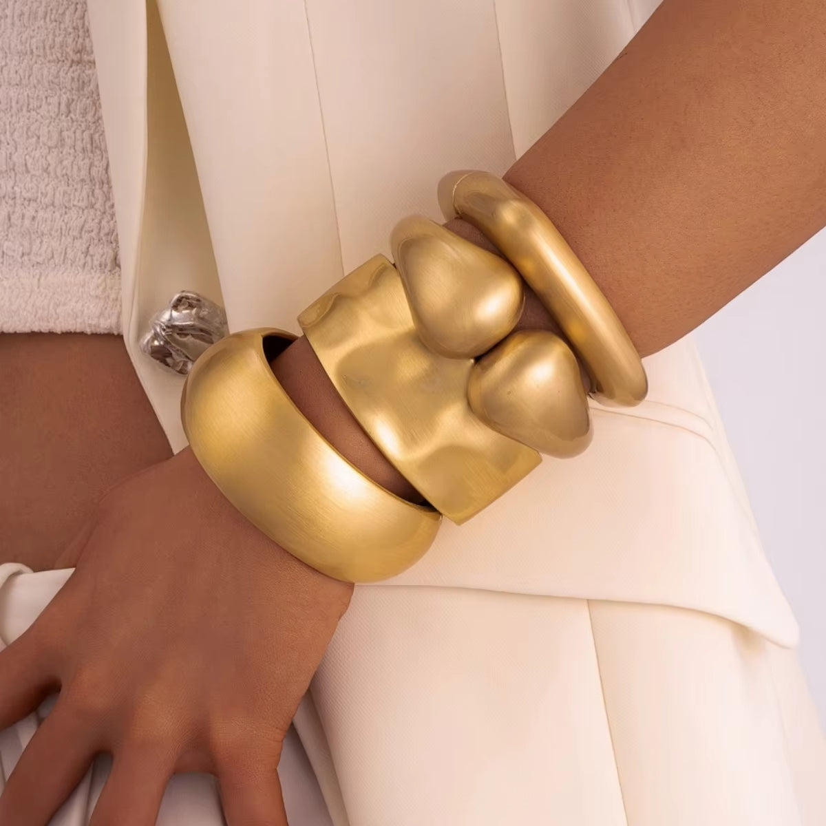 Style: This Chunky Bangle Bracelet Stack features bold, oversized bangles designed to create an effortlessly chic layered look. The substantial design makes a striking statement while offering versatility for both casual and dressy occasions. Material: Crafted from durable metal alloy with a polished finish that provides lasting shine and resistance to daily wear while maintaining its sophisticated appearance. Size: Features a universal fit design that comfortably accommodates most wrist sizes, with smooth interior edges for comfortable all-day wear.