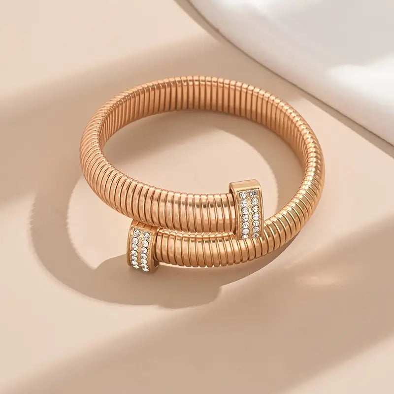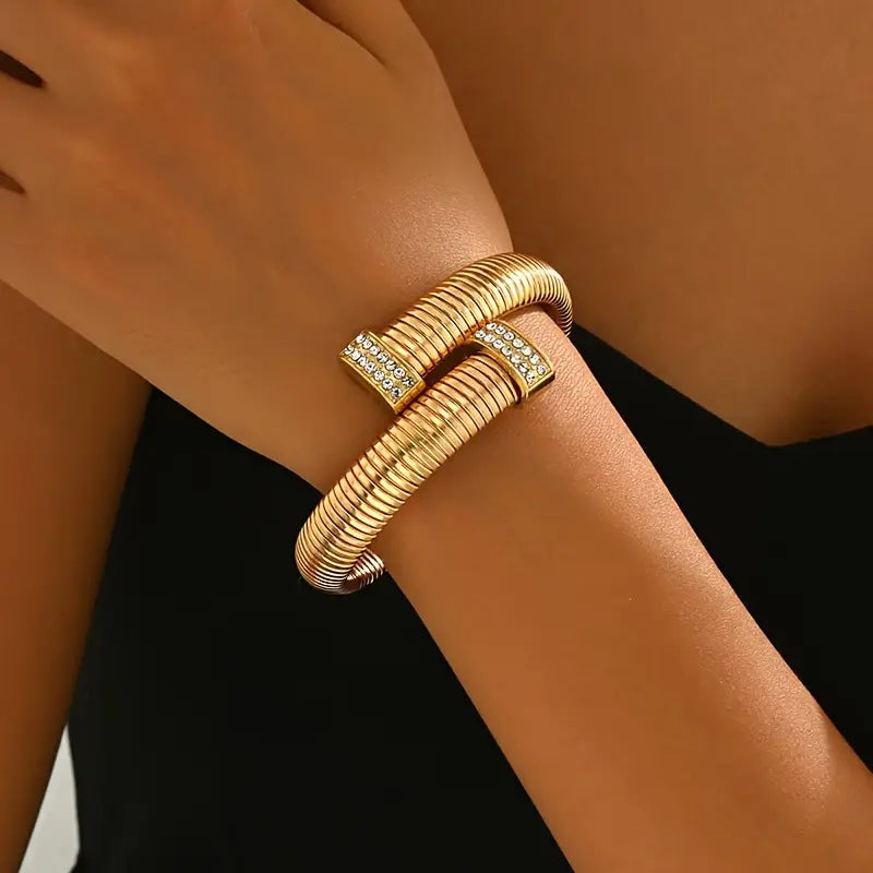 Style: This Coiled Gold Statement Bracelet features an elegant spiral design that wraps gracefully around the wrist. The sculptural coiled form creates visual interest and modern sophistication, making it a versatile piece for both everyday wear and special occasions. Material: Crafted from high-quality iron with a lustrous gold finish that provides durability and lasting shine, ensuring the piece maintains its elegant appearance through regular wear. Size: The bracelet measures 1.6 x 6.8 cm (0.63 x 2.68 in) with an adjustable fit design that comfortably accommodates various wrist sizes for personalized comfort.
