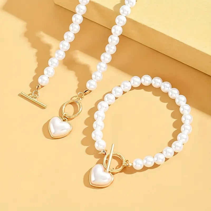 Style: This charming jewelry set features a matching necklace and bracelet adorned with classic pearls and a heart-shaped toggle clasp. The romantic detailing paired with timeless design makes it perfect for everyday wear or special occasions. Material: Made from high-quality faux pearls and gold-plated stainless steel, offering durability, shine, and an elegant finish. Size: The necklace measures approximately 42 cm (16.54 inches), and the bracelet measures approximately 21 cm (8.27 inches), providing a comfortable and secure fit.