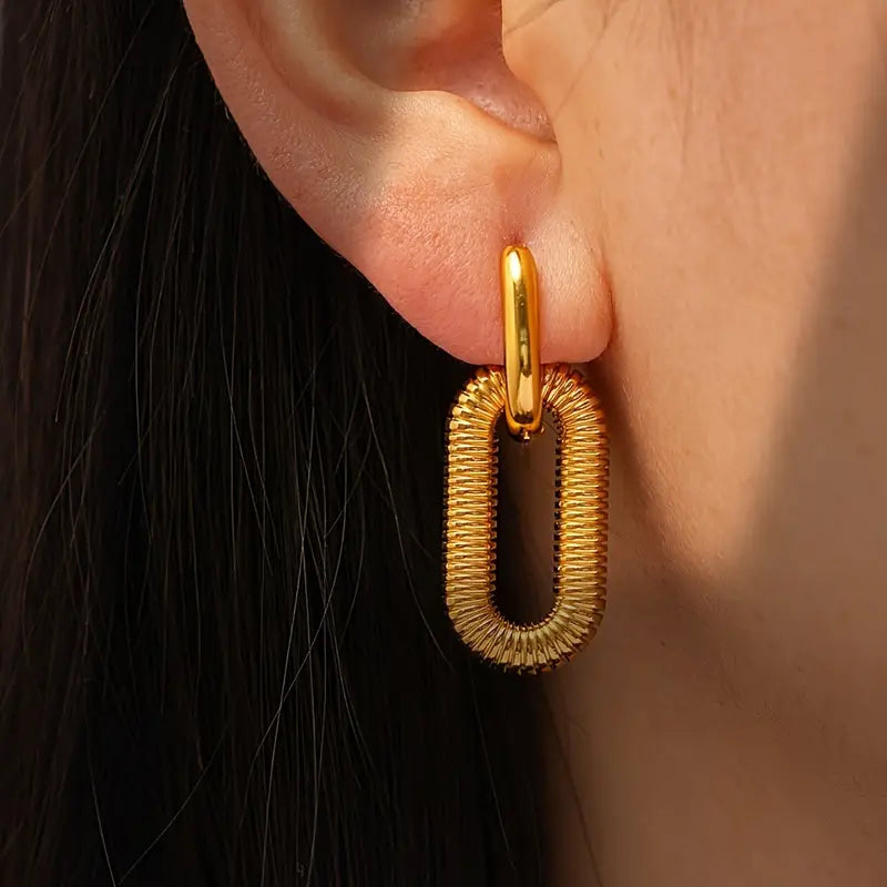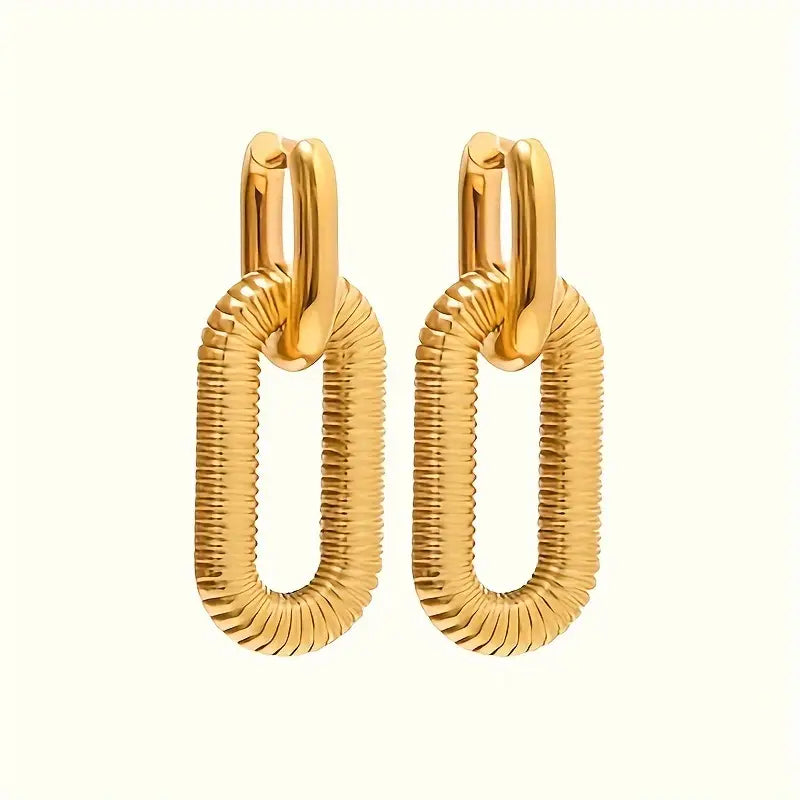 Style: These geometric dangle earrings feature elongated oval shapes with clean lines and modern elegance. Their lightweight design and minimalist silhouette make them a versatile statement for day or night. Material: Crafted from high-quality gold-plated stainless steel for a polished finish and long-lasting wear. Size: 1.3 x 3.0 cm / 0.51 x 1.18 in