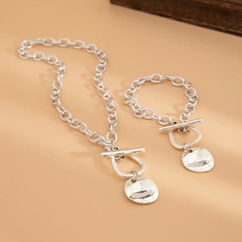 Style: This Toggle Disc Jewelry Set features sleek circular disc pendants with modern toggle clasps for a contemporary, minimalist aesthetic. The coordinated two-piece collection offers effortless sophistication, perfect for creating a polished look that transitions seamlessly from day to evening. Material: Crafted from high-quality metal with a smooth, polished finish and distinctive toggle closures, providing durability and lasting shine while ensuring secure, comfortable wear. Size: The necklace measures 40 cm (15.7 in) and the bracelet measures 18 cm (7.09 in), offering perfectly proportioned pieces that create a harmonious coordinated set.